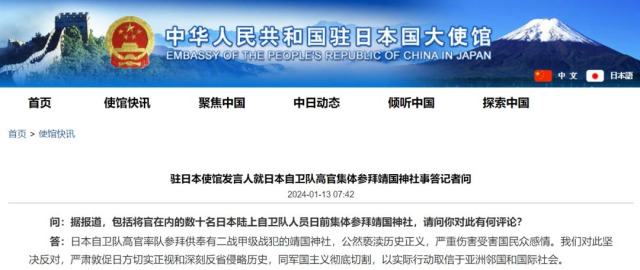 1月13日,驻日本使馆发言人就日本自卫队高官集体参拜靖国神社事答记者问。