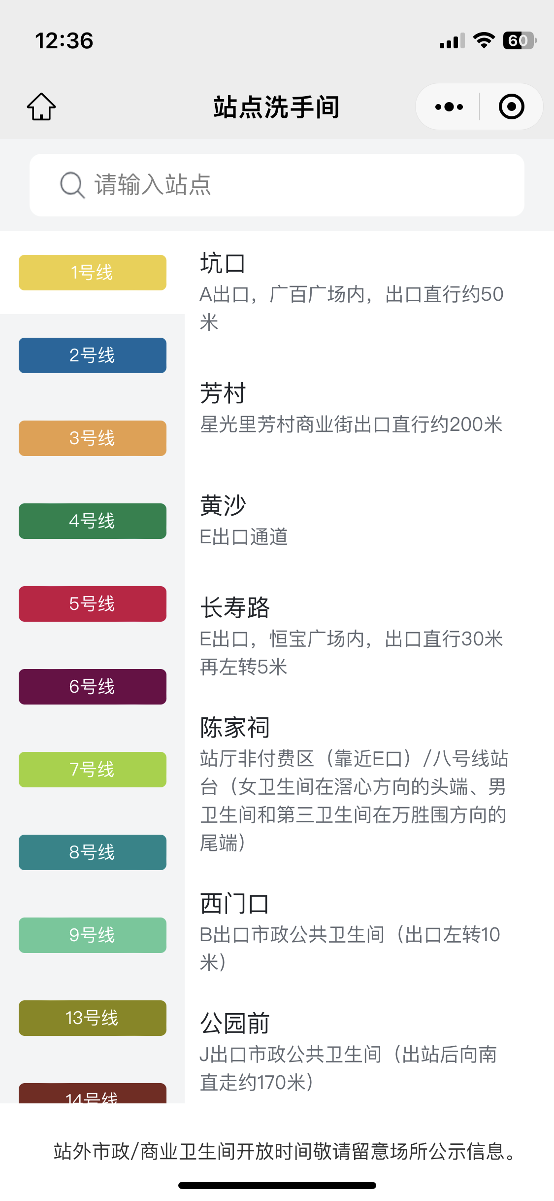 羊城晚报全媒体记者尝试扫码后,看到“站点洗手间”界面上显示有广州地铁线网各线路、海珠有轨线路以及佛山地铁二、三号线及南海有轨电车一号线共20条线路的站点信息,点击相应线路可看到对应站点下关于站内或车站就近公共卫生间的提示。比如:一号线坑口站提示“A出口,广百广场内,出口直行约50米”,说明该站厕所在车站A口外步行约50米的广百广场内;而五号线员村站提示“二十一号线站台,增城广场方向的尾端”,则表示该站厕所设在二十一号线站台往增城广场方向的尾端处。
