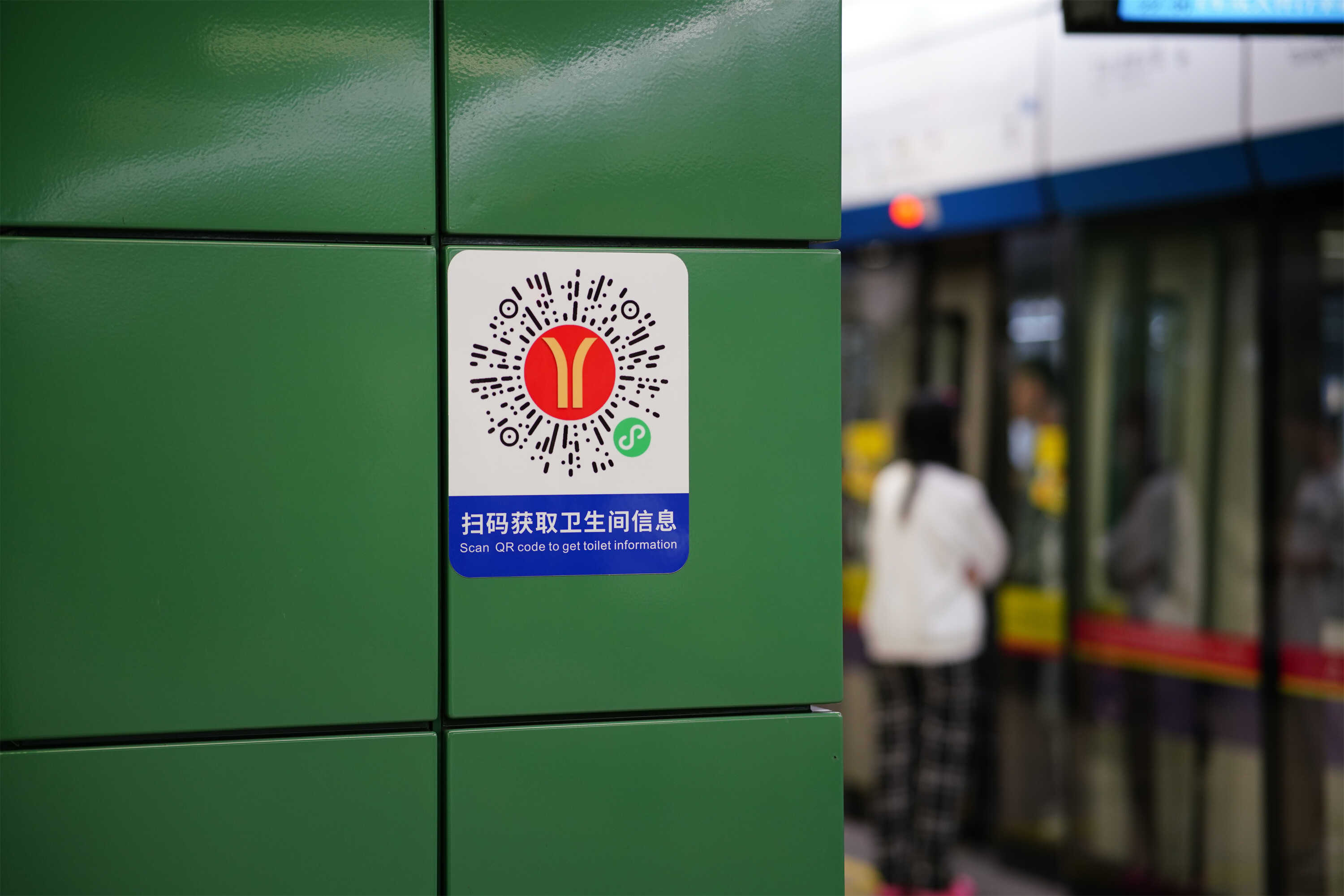 该标识一般设在车站站台、站厅(进闸机附近)、换乘通道以及列车车门上方,扫码后可快速查询到线网各车站内及就近范围的公共卫生间信息,以便乘客出行中的不时之需。