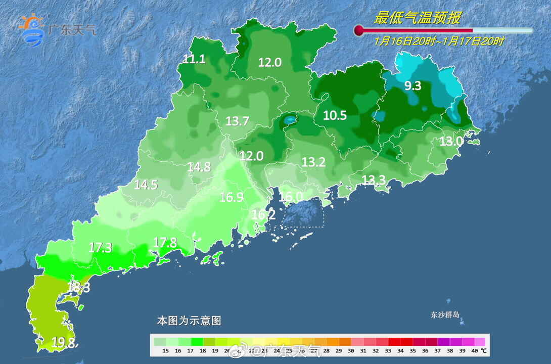 今明两天(16-17日),粤西市县多云间阴天,局部有小雨,其余市县晴到多云为主;西部市县早晚有轻雾。早晨最低气温:粤北、粤东和珠江三角洲北部市县7℃~12℃,珠江口附近和粤西沿海市县15℃~20℃,其余市县12℃~15℃。