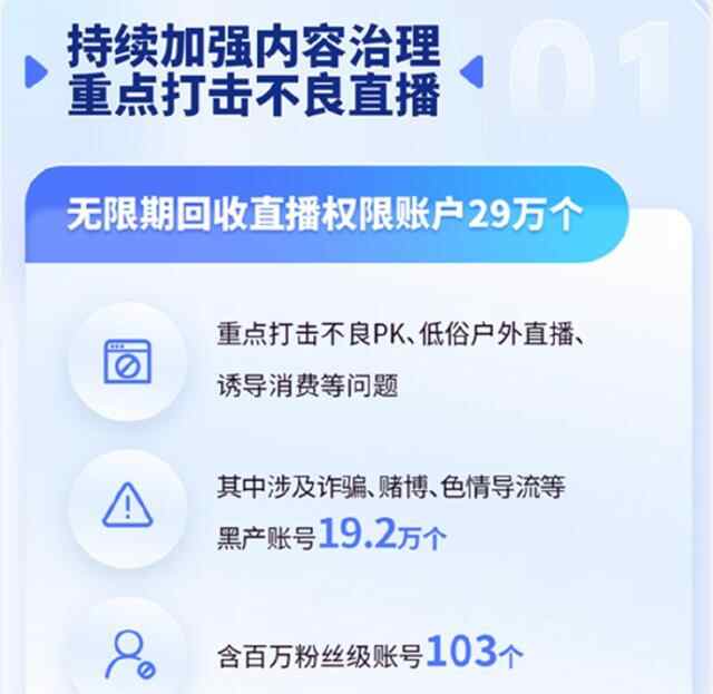 据报道,1月16日,抖音直播发布2023年度平台治理盘点,全年持续打击不良PK、户外低俗等不良直播问题,无限期回收直播权限账号29万个,其中包括“秀才”“林先生”等头部主播。同时,抖音直播不断创新和完善主播管理机制,通过对认证主播、优质内容的扶持,打造健康正向的直播环境。