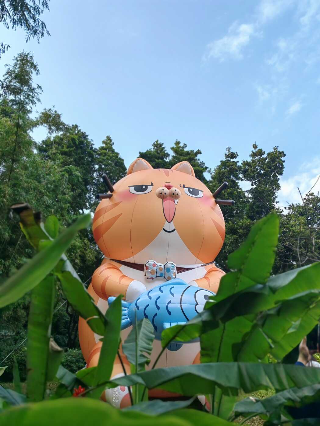 此外,广州兰圃还设置了多个猫咪形状的艺术装置。从入口处探头探脑、喜感十足的气模猫咪,到趴在墨西哥落羽杉大草坪上8米高的巨型“兰喵”,从分别穿着汉服、旗袍、中山装和头戴醒狮帽的全园最红猫咪模型打卡点,再到最新加盟兰圃、落户桃花岛的超大型“花果山大橘”,园区内猫咪元素随处可见,营造出猫咪丛林探秘的独特意境,也吸引了众多游客现场拍照打卡。