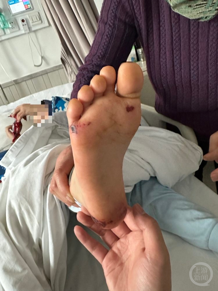 外婆在照顾他,稍稍掀开露出孩子的双脚,多个脚趾尖上的淤血还未褪去,“还有些伤,好在是娃儿现在精神还可以,吃饭什么的也在慢慢恢复正常。”比起前几日找不到孩子的焦虑,现在的情况已经让家人欣慰多了。