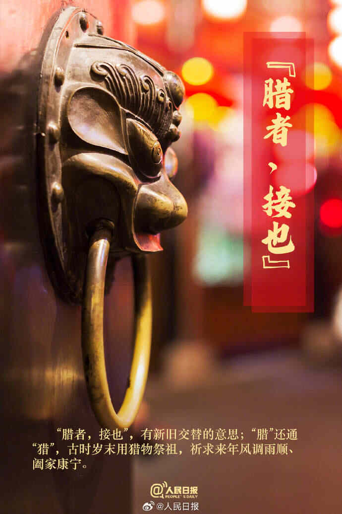 岁终之月称“腊”的含义有三:一曰腊者,接也,寓有新旧交替的意思(《隋书·礼仪志》记载);二曰腊者同猎,指田猎获取禽兽好祭祖祭神,“腊”从“肉”旁,就是用肉“冬祭”;三曰腊者,逐疫迎春,腊八节又谓之“佛成道节”,亦名“成道会”,可以说是十二月初八为腊日之由来。