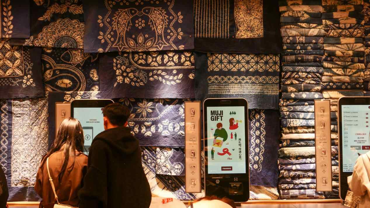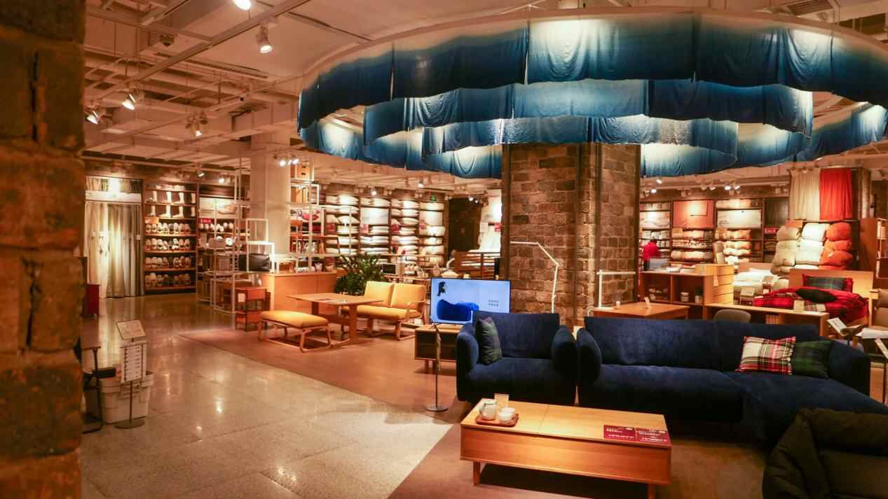 在昆明顺城旗舰店里,MUJI无印良品整家店在品牌视觉设计的基础上,以扎染艺术作为空间点缀方式,把云南风情融入其中。建筑素材以具有云南地域特色的古砖、古材为主,卖场分界处设置牌坊;根据特殊建筑物形状,设计中心地带,通向各卖场分区、并且融合各种要素,让卖场分区之间产生关联性;同时连接当地,选用昆明当地花卉进行贩售。