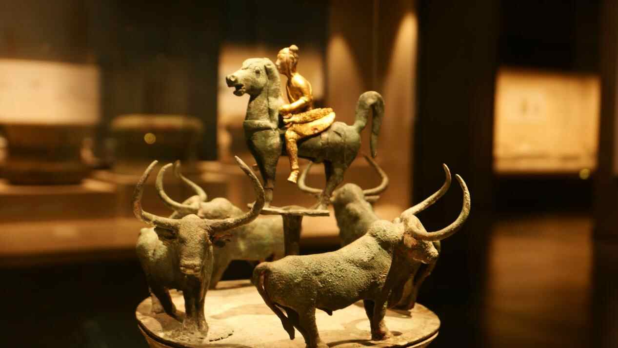 云贵高原在古时候地处边陲,人们学习着中原的青铜器生产技艺,来创造和记述彩云之南的历史,其中战争场面铜贮贝器盖展现了古滇国的剽悍野性;牛虎铜案体现古云南人对自然的崇敬;四牛鎏金骑士贮贝器则展现人与自然和谐相处的理念。