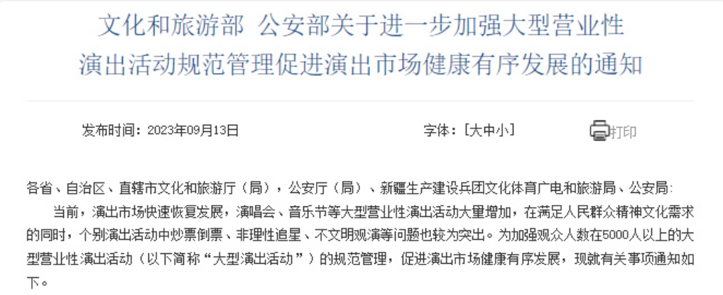 2023年9月,文化和旅游部、公安部联合发布《关于进一步加强大型营业性演出活动规范管理促进演出市场健康有序发展的通知》,通知明确,演出举办单位应当建立大型演出活动退票机制,设定合理的梯次退票收费标准,保障购票人的正当退票权利。通知要求,文化和旅游行政部门要加强对演出票务销售平台的管理。