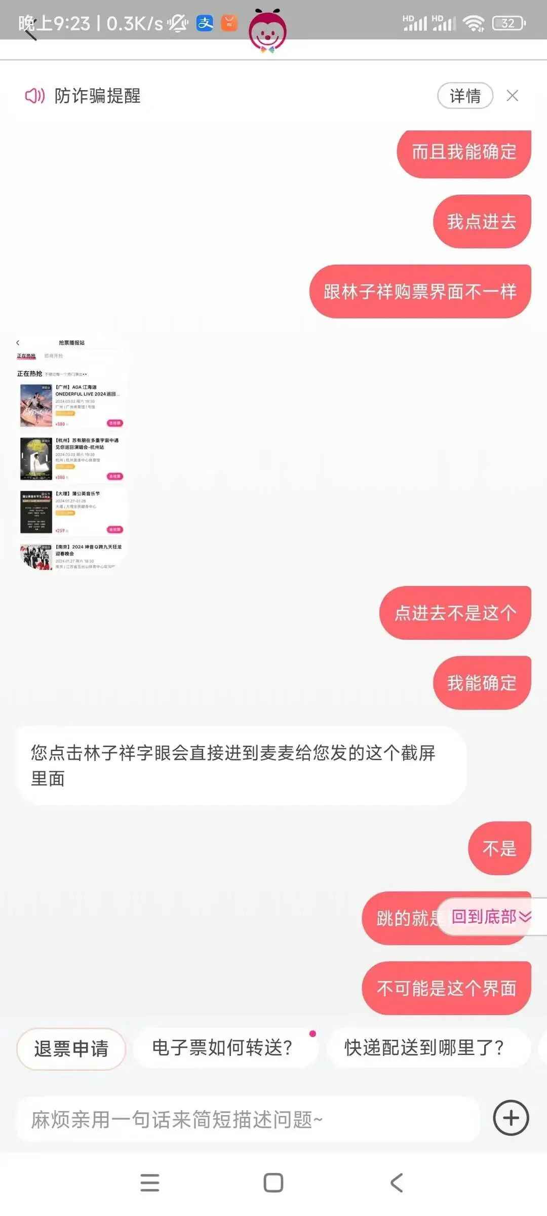 四川成都蒋女士是上述情况的亲历者,1月12日,她抢到了林俊杰演唱会门票,刚要和朋友开心分享,却突然发现,自己买到的并不是林俊杰演唱会的门票,而是“2024林子祥50坚演唱会”。她第一时间想要退票,却被大麦平台告知人工客服已下班,第二天早上9点客服上班后,该演唱会晚上7点半开演,按照退票规则,已禁止退票。