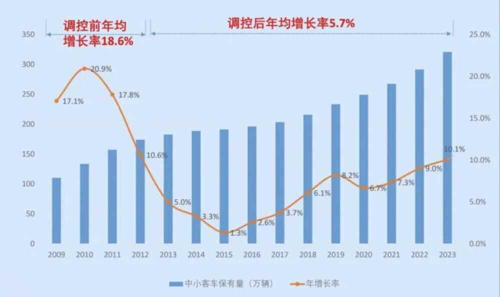 广州市自2012年7月起实施中小客车指标调控政策以来(截至2023年12月),广州市中小客车指标调控管理办公室累计配置各类指标约462.6万个,中小客车保有量由2012年6月底的169.4万辆增长至2023年12月底的320.8万辆,年均增长约13.2万辆,年均增长率由调控前的18.6%下降至调控后的5.7%,中小客车保有量迅猛增长的势头得到有效遏制。