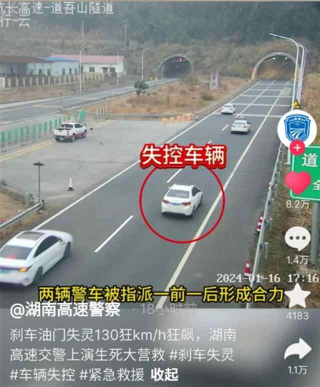 16时52分,民警李强发现失控小车后,立即驾驶警车在该车前方牵引。17时16分,大队教导员刘振宇、民警张烨驾驶警车紧随失控小车示警,并通过鸣警笛、喊话等方式提醒过往车辆注意避让。监控画面显示,两辆警车一前一后护送失控小车进入隧道,此时白色小车仍保持高速向前行驶状态,且前方有两台小车正在并行。