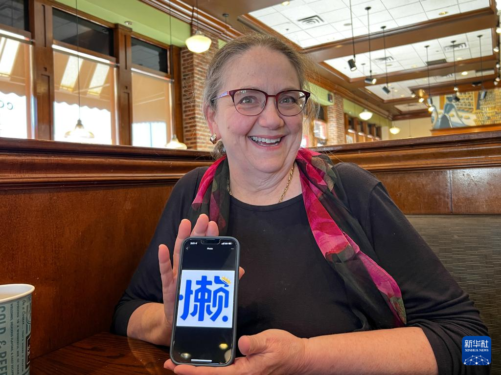 1月9日,在美国得克萨斯州达拉斯,朱丽叶·托马斯用手机展示她的微信头像“懒”字,意在提醒所有人监督她学中文要勤奋,不要偷懒。新华社发(田丹摄)