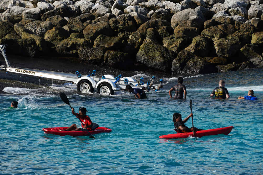1月18日,在瑙鲁阿尼巴雷湾,人们在海面上戏水休闲。新华社记者 王申 摄