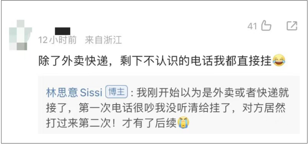 也有网友表示:除了外卖快递,剩下不认识的电话都直接挂。