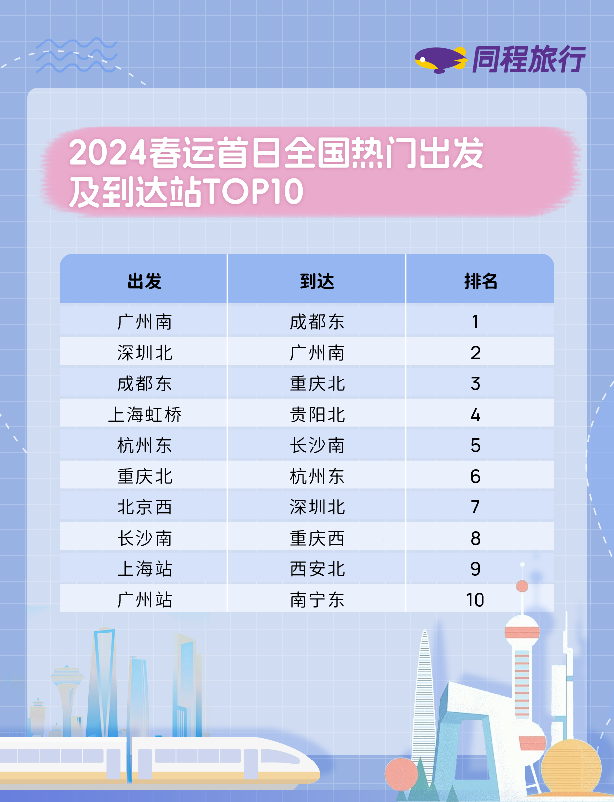 同程旅行春运大数据显示,春运首日以及第一周的客流结构主要以返乡过年的务工人员为主,流动方向主要是从东部城市、中心城市流向中西部地区。除了长线出行外,长三角、珠三角及其他重点区域城市群之间的城际高铁线路的客流量也将显著增加,预计在除夕前2至3天达到客流高峰。