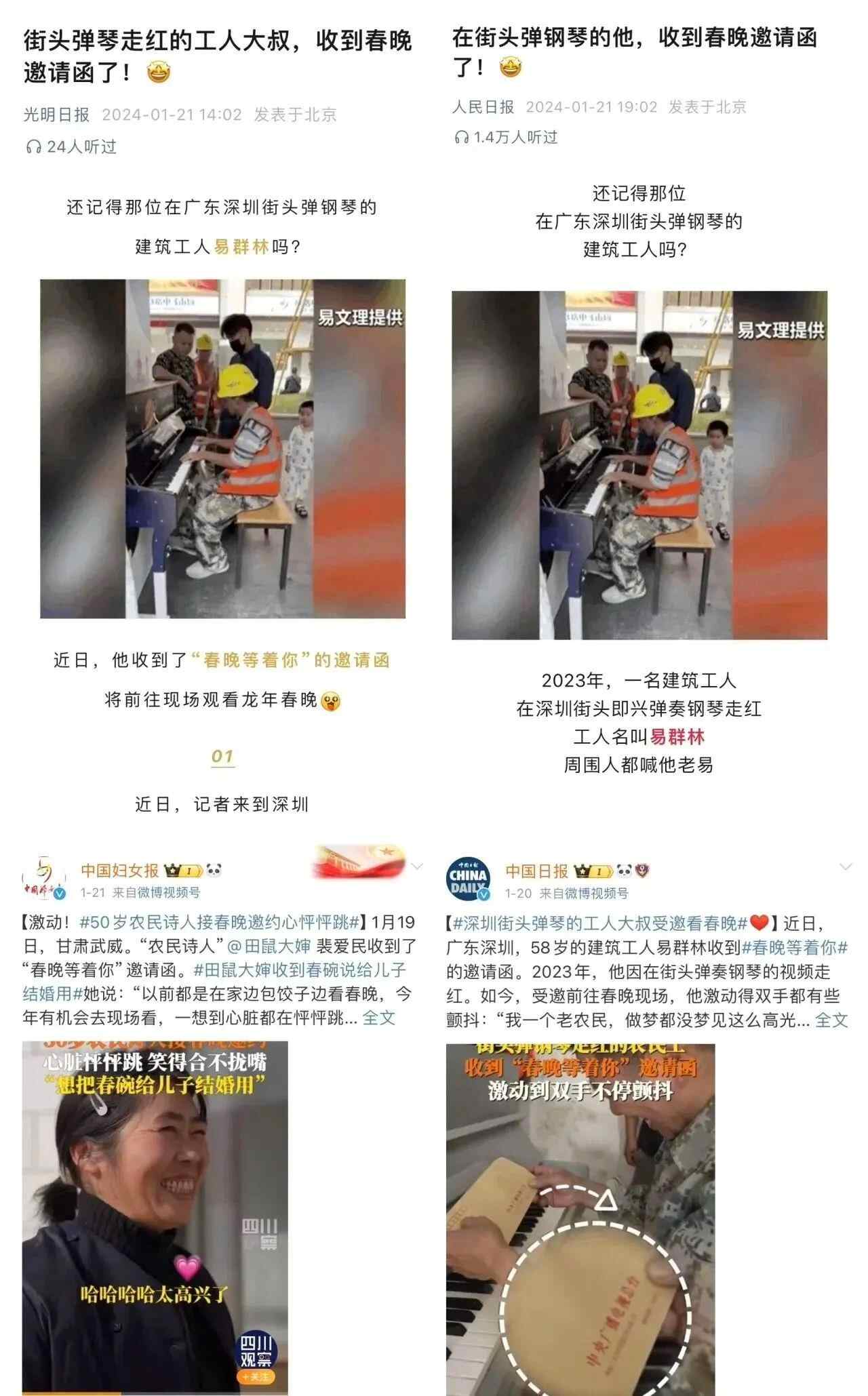 这几天,#郎朗回应58岁建筑工人钢琴之约#登上微博热搜榜第1位,#58岁弹钢琴的工人大叔受邀看春晚##土豆苞米的故事她写了20万字##50岁田鼠大婶在线更新春晚日记##50岁农民诗人接春晚邀约心怦怦跳#等话题登上多平台热搜,人民日报、光明日报、学习强国、共青团中央、中国日报、中国青年报、中国妇女、中国妇女报等官方媒体陆续跟进报道。