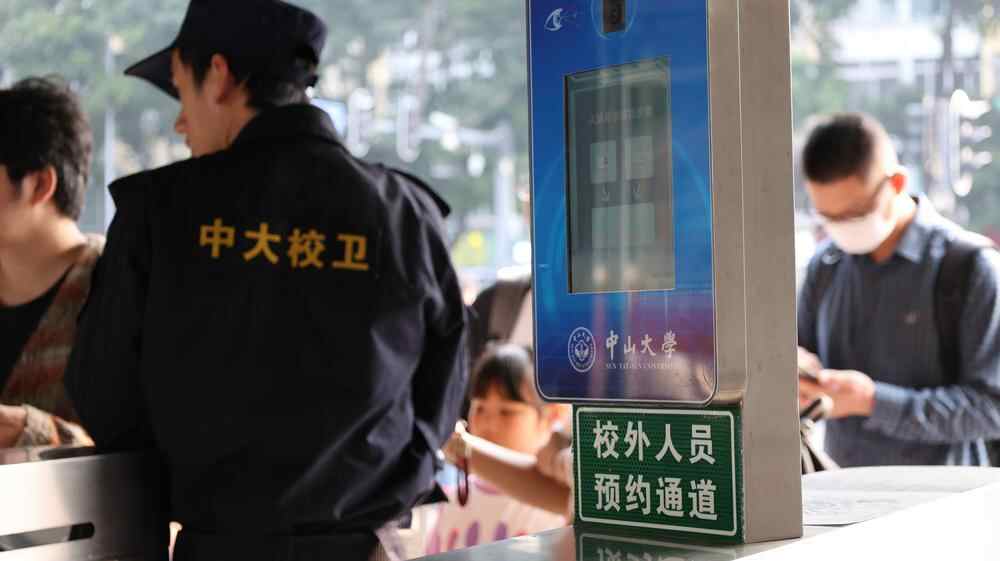 记者实地观察发现,中大南校园南门为游客入校指定校门,分为两侧通道,左边为师生通道,右边为校外人员通道,入口处摆有预约提示立牌,安保人员对游客预约信息进行核查。