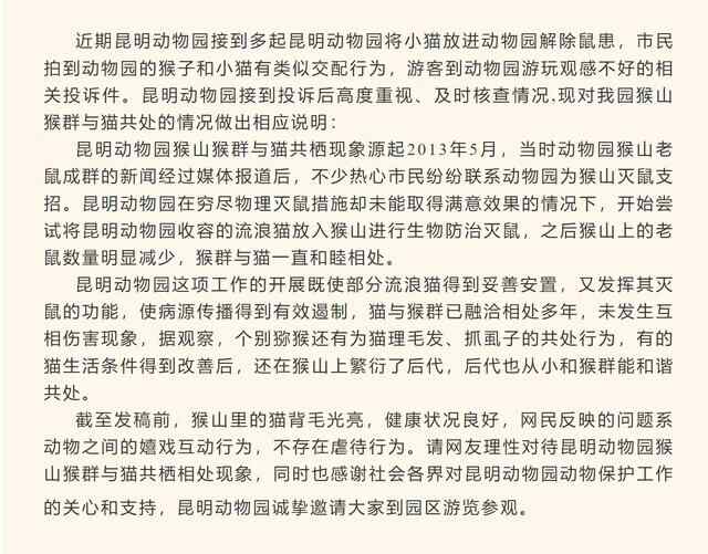 今年1月18日,昆明动物园发布了一份关于园内猴山猴群与猫共处的说明。说明中表示,猴山猴群与猫共栖现象源起2013年5月,当时动物园猴山老鼠成群的新闻经过媒体报道后,不少热心市民纷纷联系动物园为猴山灭鼠支招。园方在穷尽物理灭鼠措施却未能取得满意效果的情况下,开始尝试将收容的流浪猫放入猴山进行生物防治灭鼠,之后猴山上的老鼠数量明显减少,猴群与猫一直和睦相处,网民反映的问题系动物之间的嬉戏互动行为,不存在虐待行为。请网友理性对待昆明动物园猴山猴群与猫共栖相处现象,同时也感谢社会各界对昆明动物园动物保护工作的关心和支持,昆明动物园诚挚邀请大家到园区游览参观。