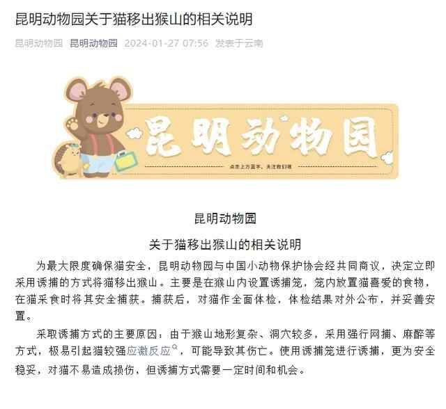 1月27日,昆明动物园发布《关于猫移出猴山的相关说明》:为最大限度确保猫安全,昆明动物园与中国小动物保护协会经共同商议,决定立即采用诱捕的方式将猫移出猴山。主要是在猴山内设置诱捕笼,笼内放置猫喜爱的食物,在猫采食时将其安全捕获。捕获后,对猫作全面体检,体检结果对外公布,并妥善安置。