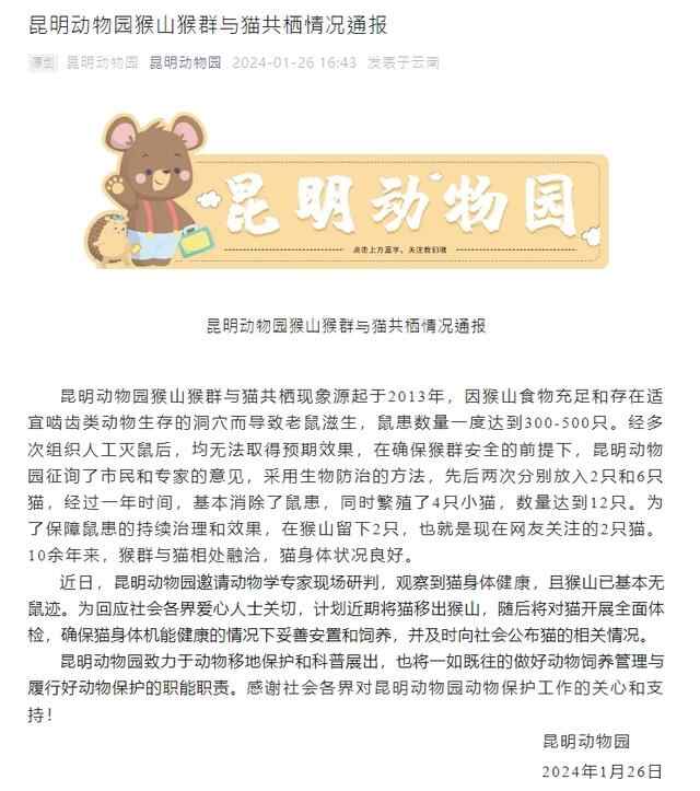 当日16时许,昆明动物园发布猴山猴群与猫共栖情况通报。通报表示,为防治鼠患,在确保猴群安全的前提下,昆明动物园征询了市民和专家的意见,采用生物防治的方法,先后两次分别放入2只和6只猫,经过一年时间,基本消除了鼠患,同时繁殖了4只小猫,数量达到12只。为了保障鼠患的持续治理和效果,在猴山留下2只,也就是现在网友关注的2只猫。10余年来,猴群与猫相处融洽,猫身体状况良好。近日,昆明动物园邀请动物学专家现场研判,观察到猫身体健康,且猴山已基本无鼠迹。为回应社会各界爱心人士关切,计划近期将猫移出猴山,随后将对猫开展全面体检,确保猫身体机能健康的情况下妥善安置和饲养,并及时向社会公布猫的相关情况。