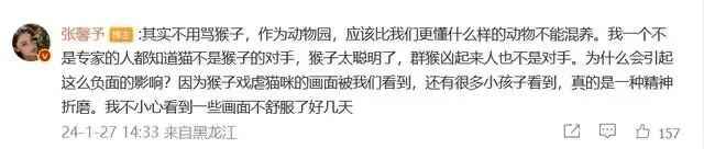 同时,她在评论区补充道:“其实不用骂猴子,作为动物园,应该比我们更懂什么样的动物不能混养。我一个不是专家的人都知道猫不是猴子的对手,猴子太聪明了,群猴凶起来人也不是对手。为什么会引起这么负面的影响?因为猴子戏虐猫咪的画面被我们看到,还有很多小孩子看到,真的是一种精神折磨。我不小心看到一些画面不舒服了好几天。”