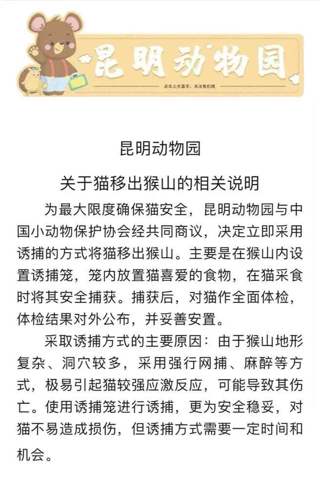 据@中国小动物保护协会 27日15时消息,中国小动物保护协会与昆明动物园进行了沟通,园方同意与协会合作把猫咪诱捕出来,并带猫咪体检,并交给中国小动物保护协会带走安置。27日上午,抓捕队员已进入猴山内部找寻猫咪。