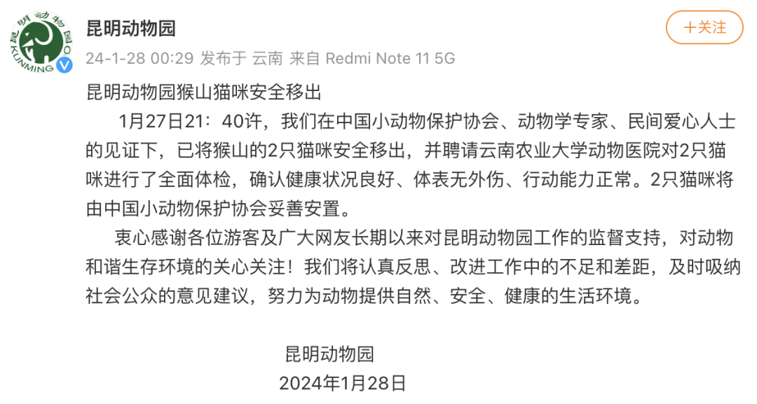 1月26日,@昆明动物园 再发通报称,计划近期将猫移出猴山,随后将对猫开展全面体检,确保在猫身体机能健康的情况下妥善安置和饲养,并及时向社会公布猫的相关情况。