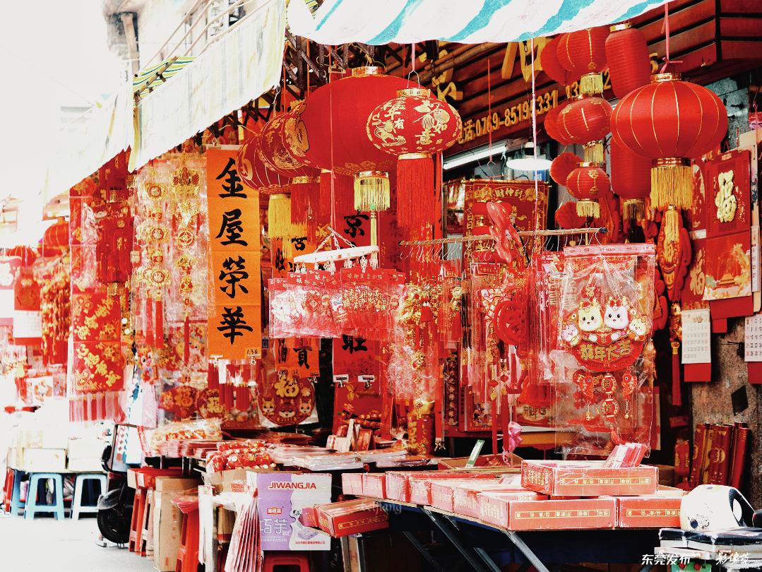 红色的灯笼、金色的对联、五彩斑斓的花束,把东莞装点得如诗如画。虎门老街、石龙中山路、各大年货市场……放眼望去的一片通红,被满满的春节气息紧紧包围。