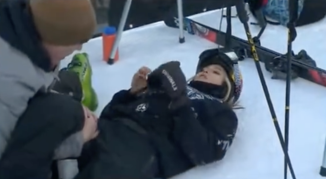 在今天的比赛中,谷爱凌首轮上场前还躺在雪地上做理疗,但站上出发点的她依然自信满满。