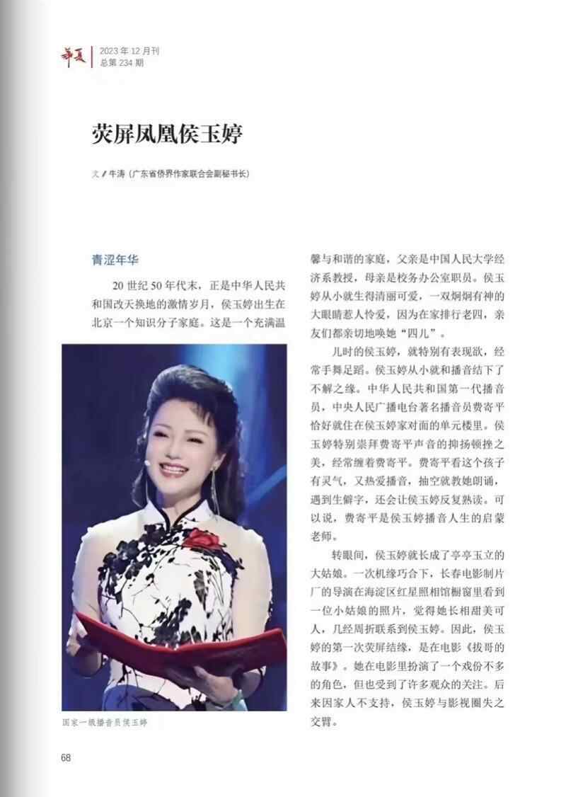 2023年12期《华夏》杂志,发表了牛涛撰写的《荧屏凤凰侯玉婷》长文。这或许是他生前最后发表的文字。