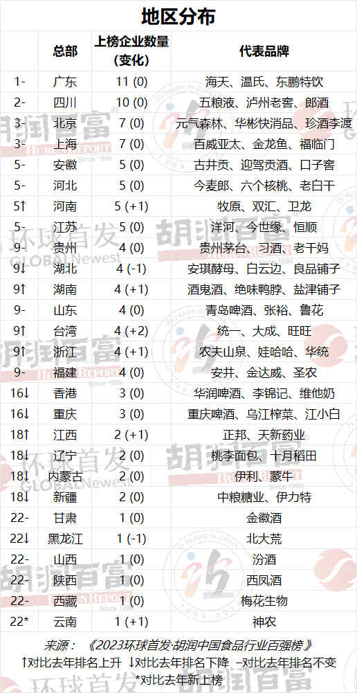 按地区划分,总部广东的企业依然最多,共11家,代表企业有海天味业、温氏股份、东鹏饮料、汤臣倍健、华润怡宝等。其次是四川,共10家企业上榜;第三位则是上海和北京,各有7家。