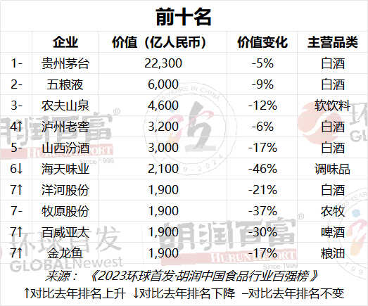 根据榜单,贵州茅台以2.2万亿价值蝉联中国食品行业最具价值企业,比去年下降5%。五粮液价值下跌9%,以6000亿元位居第二。钟睒睒的农夫山泉以4600亿元价值位居前三,虽然比去年下降12%,仍然是价值最高的软饮企业。