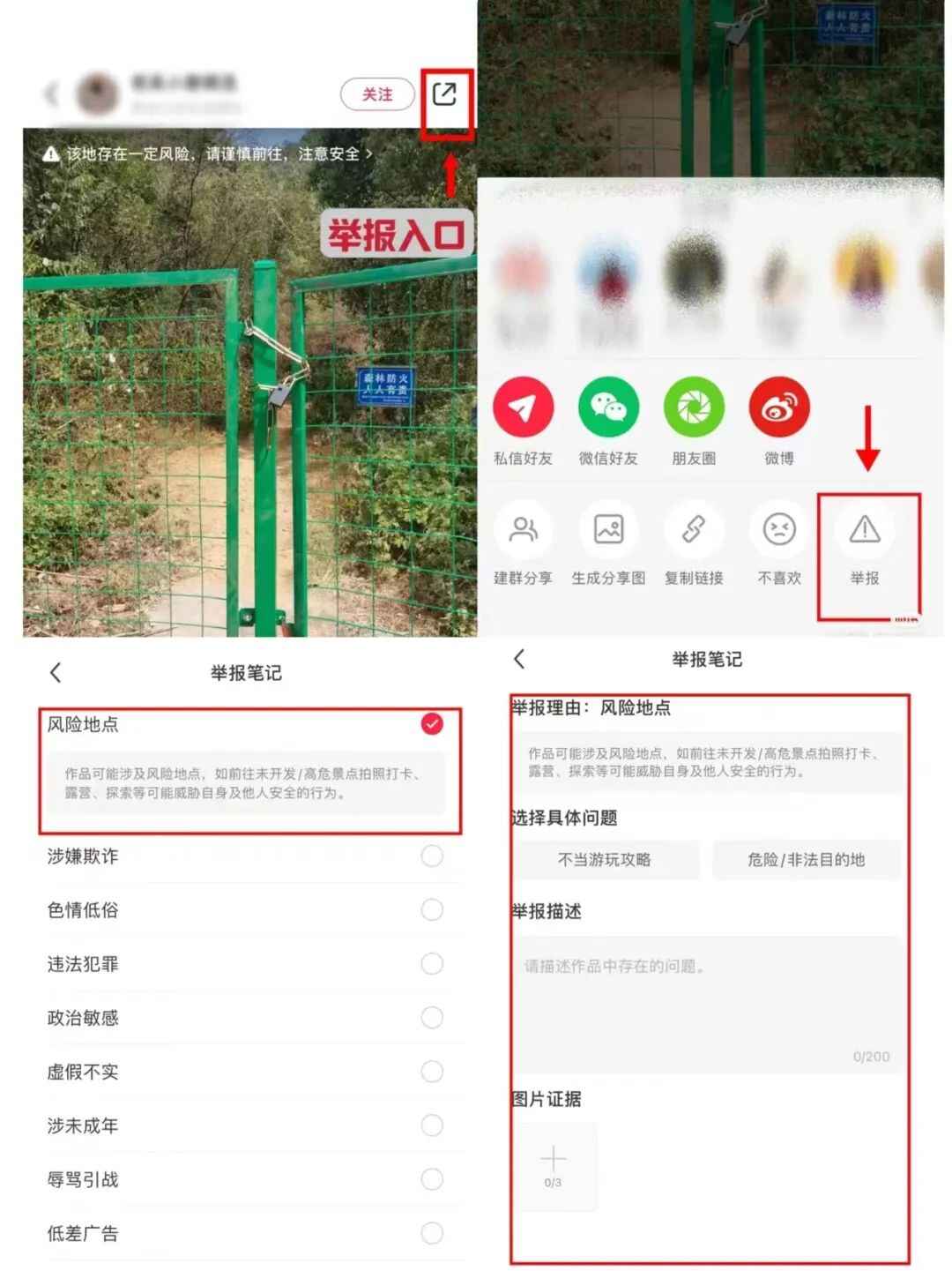 在具体操作过程中,用户所发布的笔记如果存在涉及前往未开发或高危景点打卡、露营、探索等可能威胁自身及他人安全的行为,均可进行“风险地点”举报。举报成功后,该笔记上方就会出现“该地存在一定风险,请谨慎前往,注意安全”的提醒。