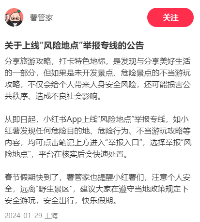 1月29日,小红书宣布上线“风险地点”举报专线。用户发现危险目的地、危险行为、不当游玩攻略等内容,均可点击笔记上方进入“举报”入口,选择“风险地点”专线,平台在核实属实后会快速处置。