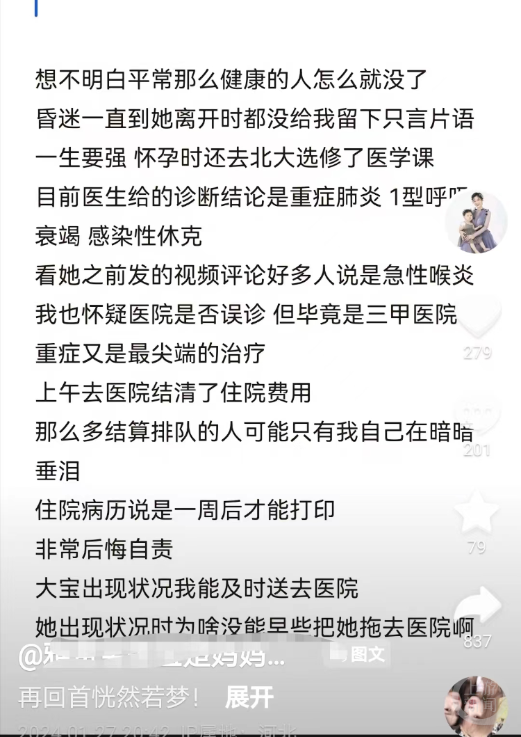 1月27日,该账号再次发文称:周五、周六媳妇的身体状况未见异常,周日她测体温发烧38.7度,她想挺着坚持给孩子母乳喂养……周一下午她体力有点不支,傍晚看她有些虚脱,晚上8点我说咱别挺着了赶紧去医院……周二医生说要镇静麻醉上呼吸机转重症监护……症状一直没有好转迹象,然后深度昏迷,历经6次抢救最终没能挽救回来。