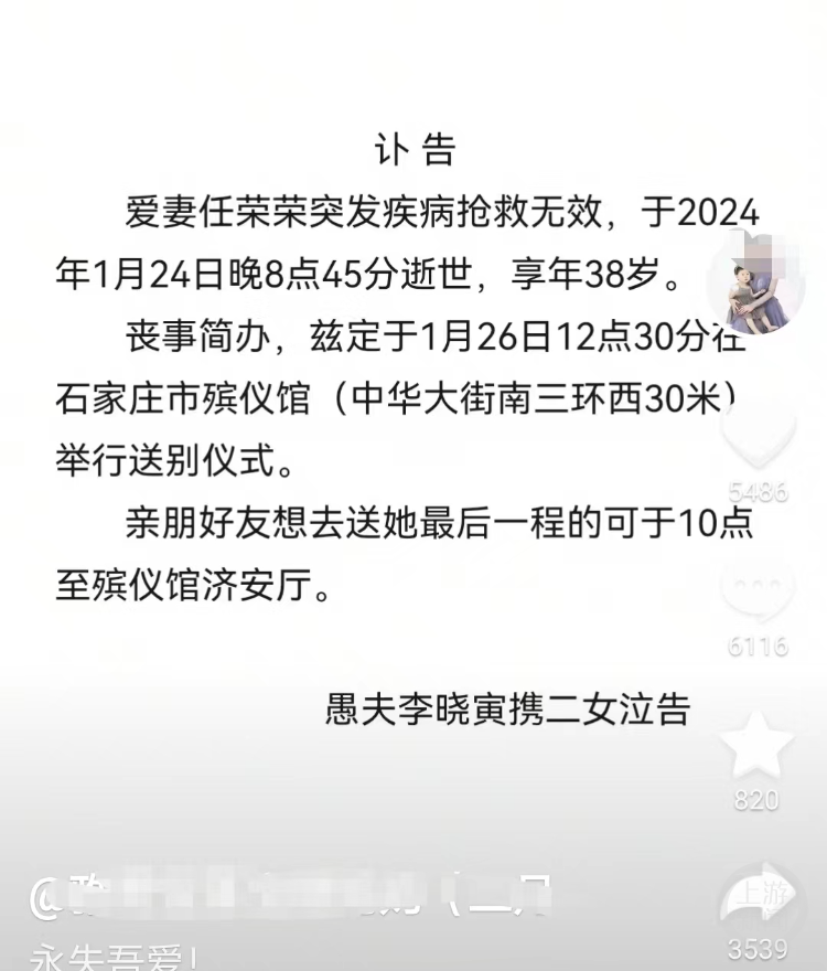 然而5天后的1月26日,该账号发布讣告称,爱妻任荣荣突发疾病抢救无效,于1月24日逝世,享年38岁。之后,该账号表示,准备保留这个账号,给亲朋还有孩子留个念想。