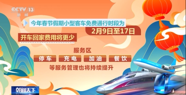 今年春节假期小型客车免费通行时段为2月9日至17日,开车回家费用将更少,服务区停车、充电、加油、餐饮等服务管理也将持续提升。希望每位旅客都能选择自己心仪的出行方式,安心启程,平安到达。