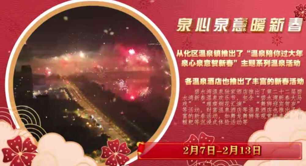 将举办文化传承贺新春、泉心泉意暖新春、赏花观景迎新春、龙精虎猛庆新春、乡村民俗品新春等五个系列,共计100多场活动。