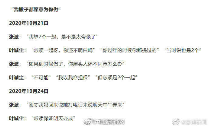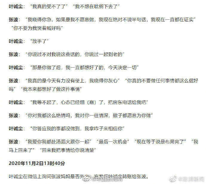 此前,媒体从相关渠道获得了张波、叶诚尘2020年6月3日至11月2日间与案件相关的微信聊天记录,这些聊天记录详细记录下张波、叶诚尘共谋作案的过程,以及张波的心理变化轨迹。