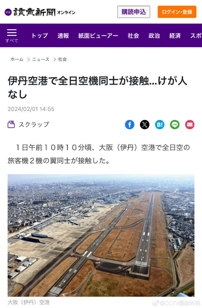 据日本《读卖新闻》消息,当地时间2月1日10时10分左右,日本全日空航空公司的两架飞机在大阪伊丹机场的停机坪发生碰撞事故。两架飞机上当时都有乘客和机组人员,事件未造成人员受伤。