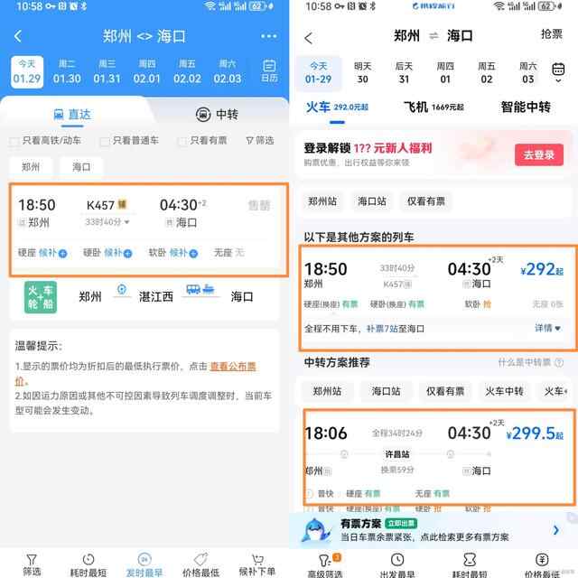 1月29日,记者在12306和携程两个平台上进行试验。当天郑州开往海口班次,18时50分发车的K457次列车,12306上显示售罄,携程上显示硬座、硬卧有票,但备注写着“全程不用下车,补票7站至海口”。