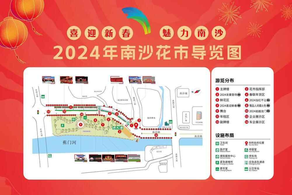 花市七大展区:鲜花区、年货工艺品区、盆桔区、乡村振兴区、工业企业展示区、本土美食区、文旅创意区;四大内容:购年货、赏美景、品美食、看展演;传统创新:太极功夫、插花工艺、广彩传承、景泰蓝、香云纱、汉服;水乡风韵:蕉门河皮划艇,非遗水乡婚俗文化、天后宫妈祖文化、南沙湿地文创推介;开幕内容:醒狮迎春;地标打卡:蕉门河公园、南沙牌坊、聚星桥、南沙图书馆、凤起湖、南沙星河COCO Park、万达广场、环宇城、绿轴公园、市民广场、儿童公园……