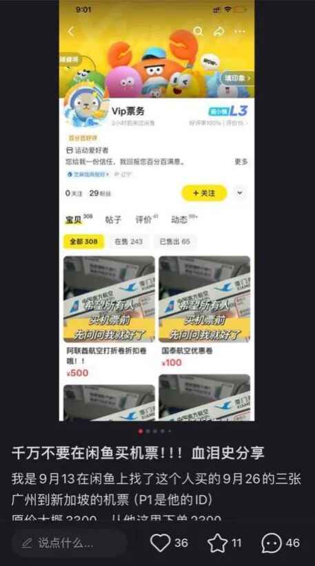 在某社交平台上,有用户近日分享帖子称,他此前在某二手平台购买了广州飞往新加坡的机票,比官网节省了1000元。购买前,发帖商家信誓旦旦百分百出票,结果几天后告知该用户出不了票。而此时,用户若重新购买机票,则比原价还要贵1000元。