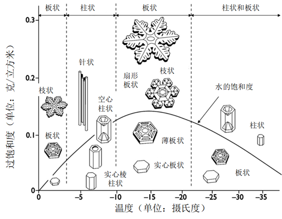 赵树云解释,以温度为横坐标轴,湿度(一般用过饱和度表达,即超过相对湿度为100%的空气程度)为纵坐标轴,雪花在不同的温度、湿度配合下会呈现不同的形状。研究表明,如果两者配合得刚好,会出现常见且标准的六角状雪花;如果温度在-5℃以下、湿度合适的情况下,会出现针状雪花;如果温度特别低,则容易出现柱状、板状雪花。