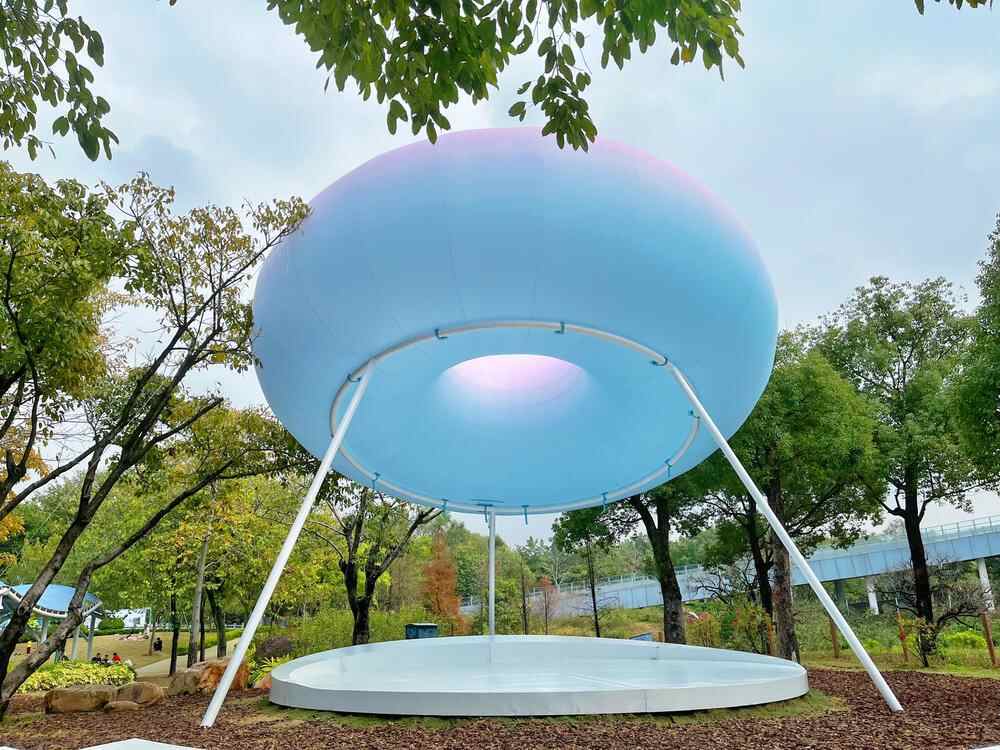 儿童公园从南至北,9组作品依次沿中轴线铺开:直径十米的悬浮甜甜圈,伞形的柠檬片,颇具民族特色的大屋顶,用四棵树打造的可站、可坐、可卧的独立空间……每一组艺术作品都以“孩童”为中心,打破城市的自然特征、地形与植被特性,让这些童真、绿色、舒适的作品提高儿童的亲绿性。