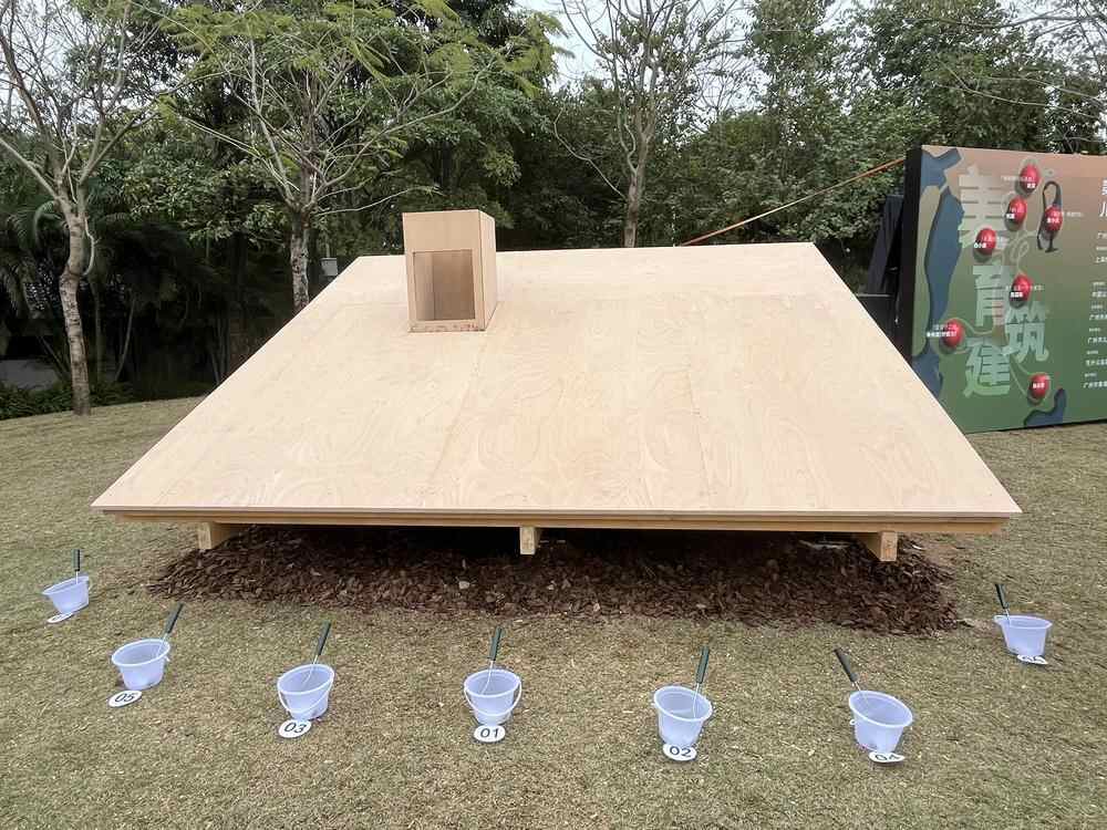 如果说“超大柠檬”意味着安全,那么《瞧!这是一个大屋顶》则代表着一次“上房揭瓦”的自由乐趣。设计师陈国栋以颇具童趣的语气诚恳地邀请小朋友们与木房子“一起玩耍”。陈国栋介绍道,作品以贵州黔东南侗族地区民居屋架作为原型,只保留大屋顶直接落地的形制,从而形成大人们进不去,小朋友却可以游戏的空间:“‘大屋顶’的内部空间及视角是只属于小朋友的‘小小世界’。”