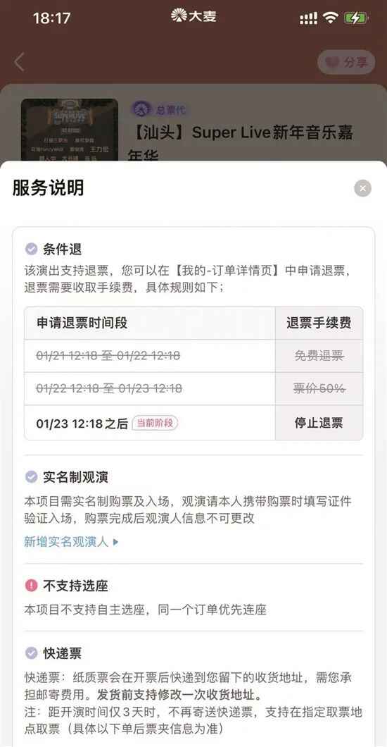 也有消费者表示,“条件退”设置了申请退票时间段、退票手续费的梯度,退票时间较短、退票手续费太高。如汕头Super Live新年音乐嘉年华的商品页显示,仅1月21日12时18分至1月23日12时18分支持申请退票,其中,1月22日12时18分至次日12时18分的退票手续费为50%,1月21日12时18分至次日12时18分才能免费退票。