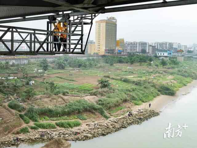 1月30日,在广茂线西江特大桥上,铁路桥梁工对桥梁进行了一次全面检查,他们手摇两侧的传动齿轮缓缓前行,认真查看桥底状况。