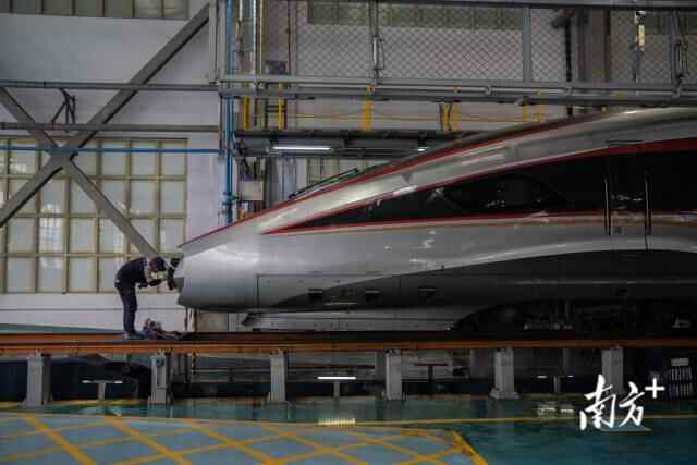 1月24日凌晨,一辆待检修的动车缓缓驶入位于广州动车段广州南所检修库,巨大的车头与检修员形成鲜明对比。