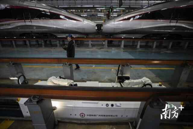 1月23日,广州动车段广州南动车运用所的工作人员正在操纵检修机器人抵达工作位置。