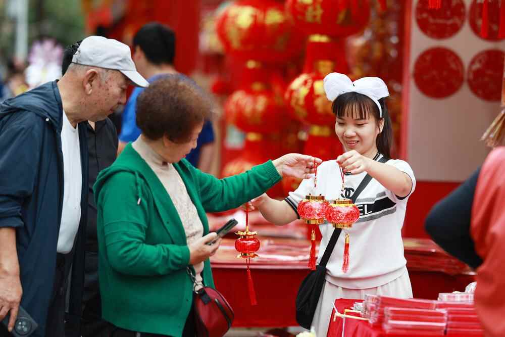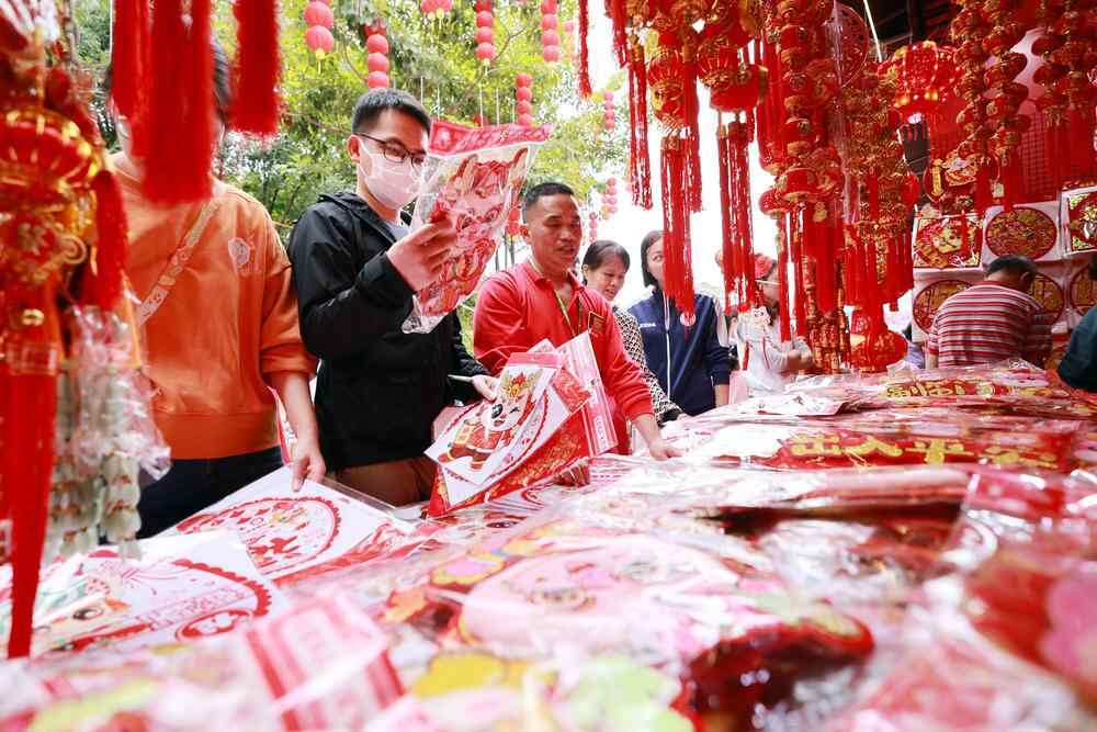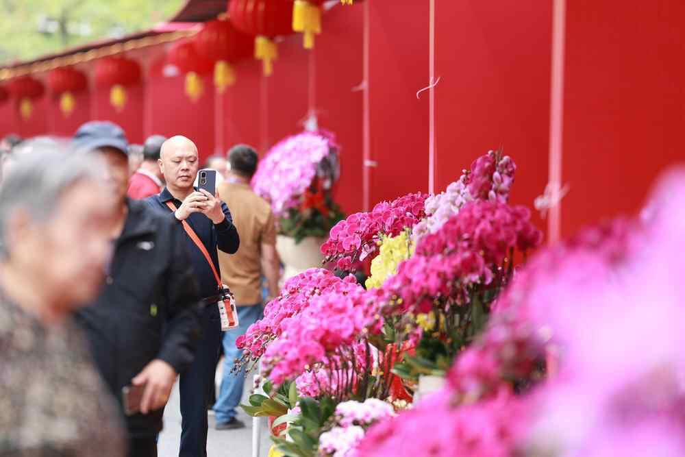 花市开张后,越来越多的市民来到花市,逛花街、选年花、备年货,“龙重登场”“喜迎新春”“当红不让”“逾越龙门”“慢品人间烟火色”五大景观小品打卡点前人潮涌动,很多市民都过来沾沾喜气,拍照留念。